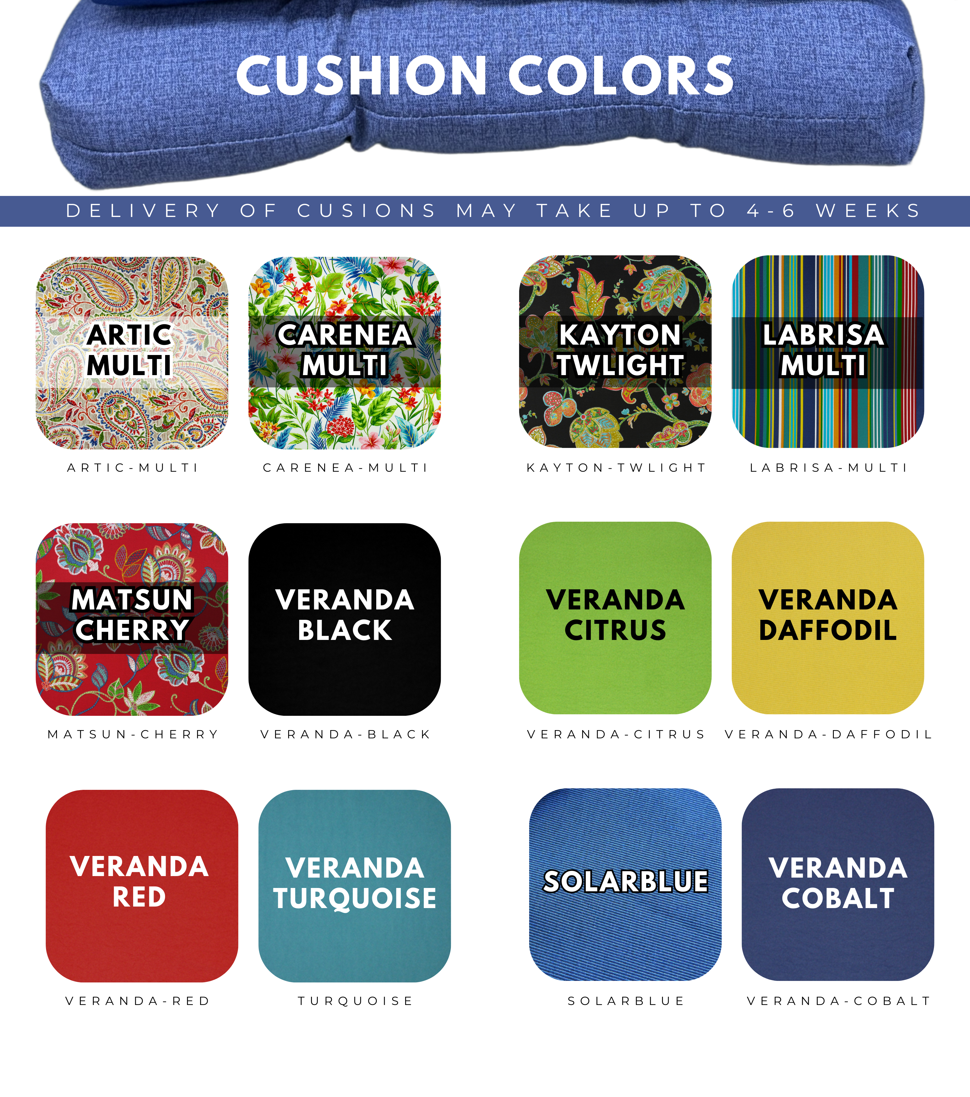 - *Allow 4-6 weeks for delivery of cushions